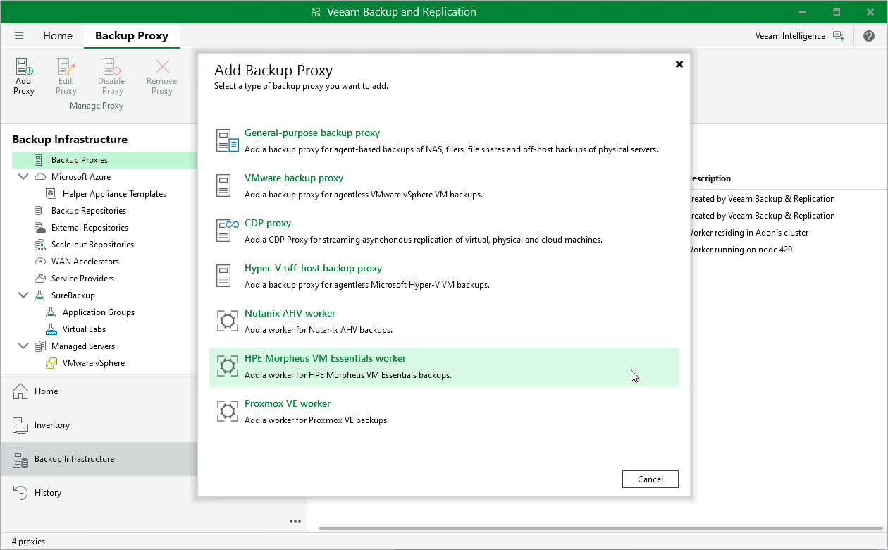 Step 1. Launch New HPE Morpheus VM Essentials Worker To launch the New HPE Morpheus VM Essentials Worker wizard, do the following:In the Veeam Backup & Replication console, open the Backup Infrastructure view.In the inventory pane, select Backup Proxies.On the ribbon, select Add Proxy.Click HPE Morpheus VM Essentials worker.