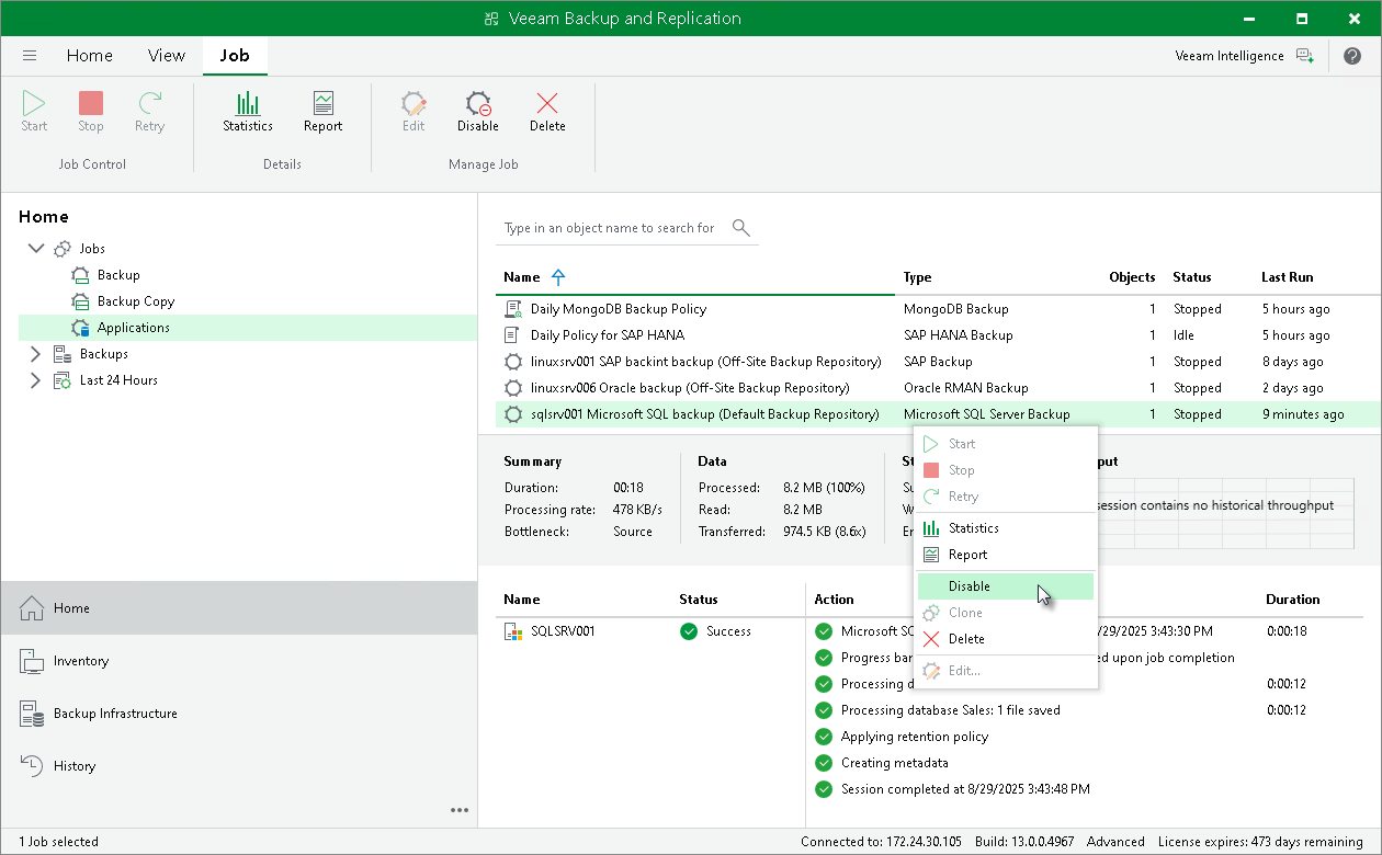 After Veeam Plug-In for Microsoft SQL Server starts the backup process, Veeam Backup & Replication creates the backup job. You can use this job to view statistics on the backup process and generate backup job reports. You can also disable the backup job.