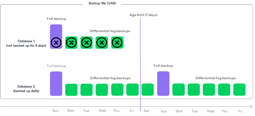 The main difference between the retention policy and the force delete operation is that the force delete operation can delete backups for specific databases and keep all other database backups in the backup file (.VAB). For example, a backup file (.VAB) contains backups for 2 databases. One of the databases becomes obsolete, so you stopped backing it up 8 days ago. The second database is active and you back up it daily. Now you want to delete all backups of the obsolete database. In this case you can run the force delete operation with an age limit of 7 days. During the force delete operation, Veeam Plug-In deletes only backups of the first database that was backed up 8 days ago and keeps backups of the second database.
