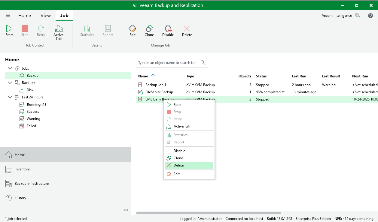 You can permanently delete a backup job from the Veeam Backup & Replication configuration database if you no longer need it. When you delete a job, backups created by this job are displayed under the Backups > Disk (Orphaned) node in the Home view of the Veeam Backup & Replication console.
