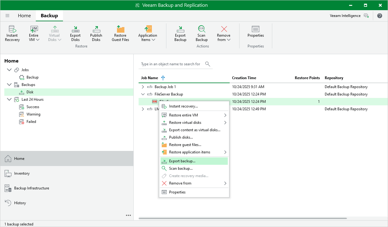 Alternatively, expand the job that created the backup, select the VM and click Export Backup on the ribbon.