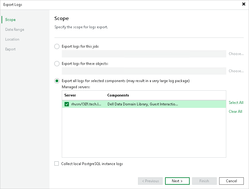 - At the Scope step of the Export Logs wizard, select the Export all logs for selected components option. Then, in the Managed servers list, select the backup server and the VM running as the backup appliance.