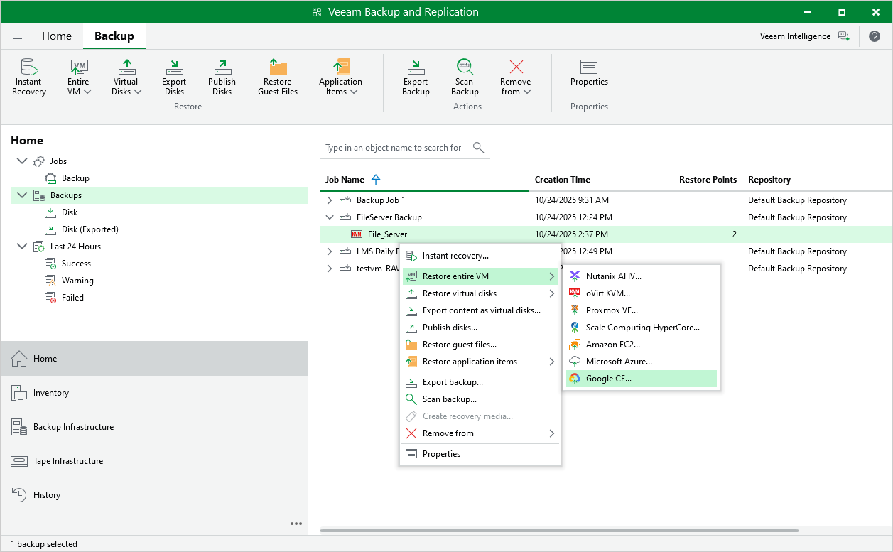 Alternatively, expand the necessary backup job, select the VM and click Entire VM > Google CE on the ribbon.