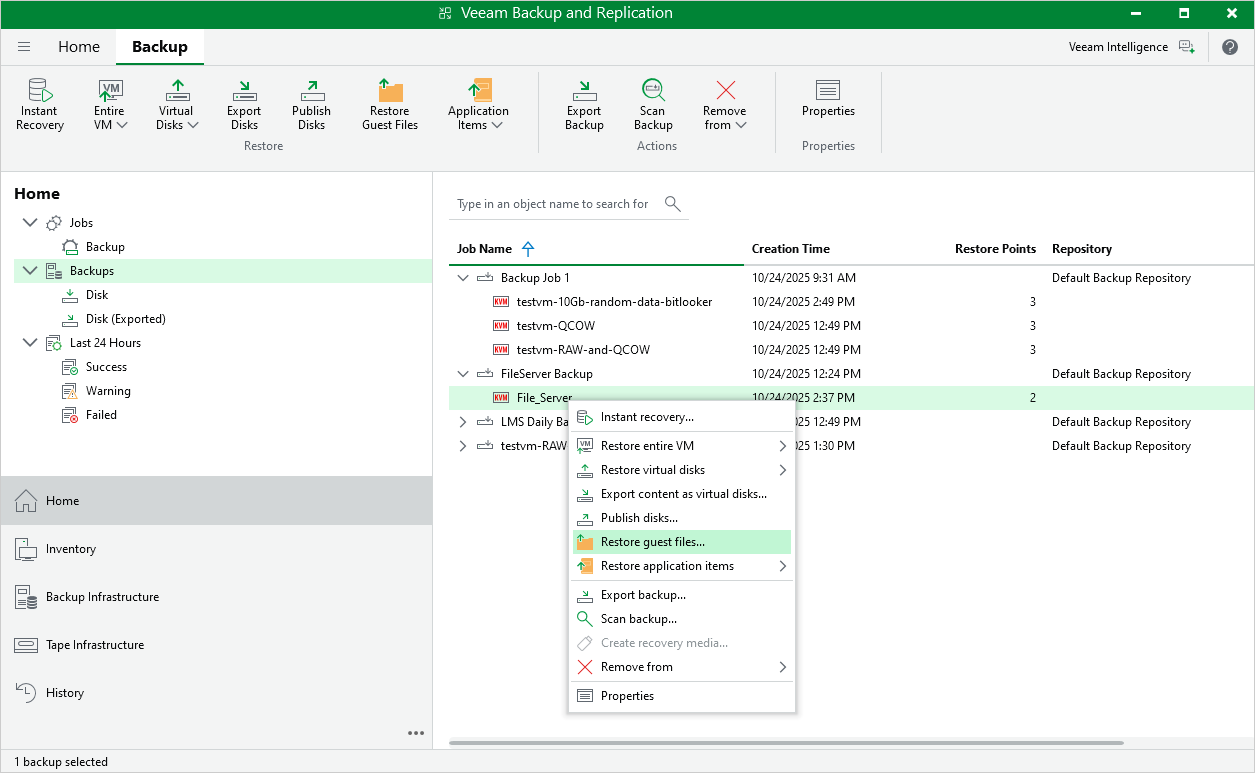 - In the working area, expand the necessary backup job, right-click the VM that contains files you want to restore and select Restore guest files.