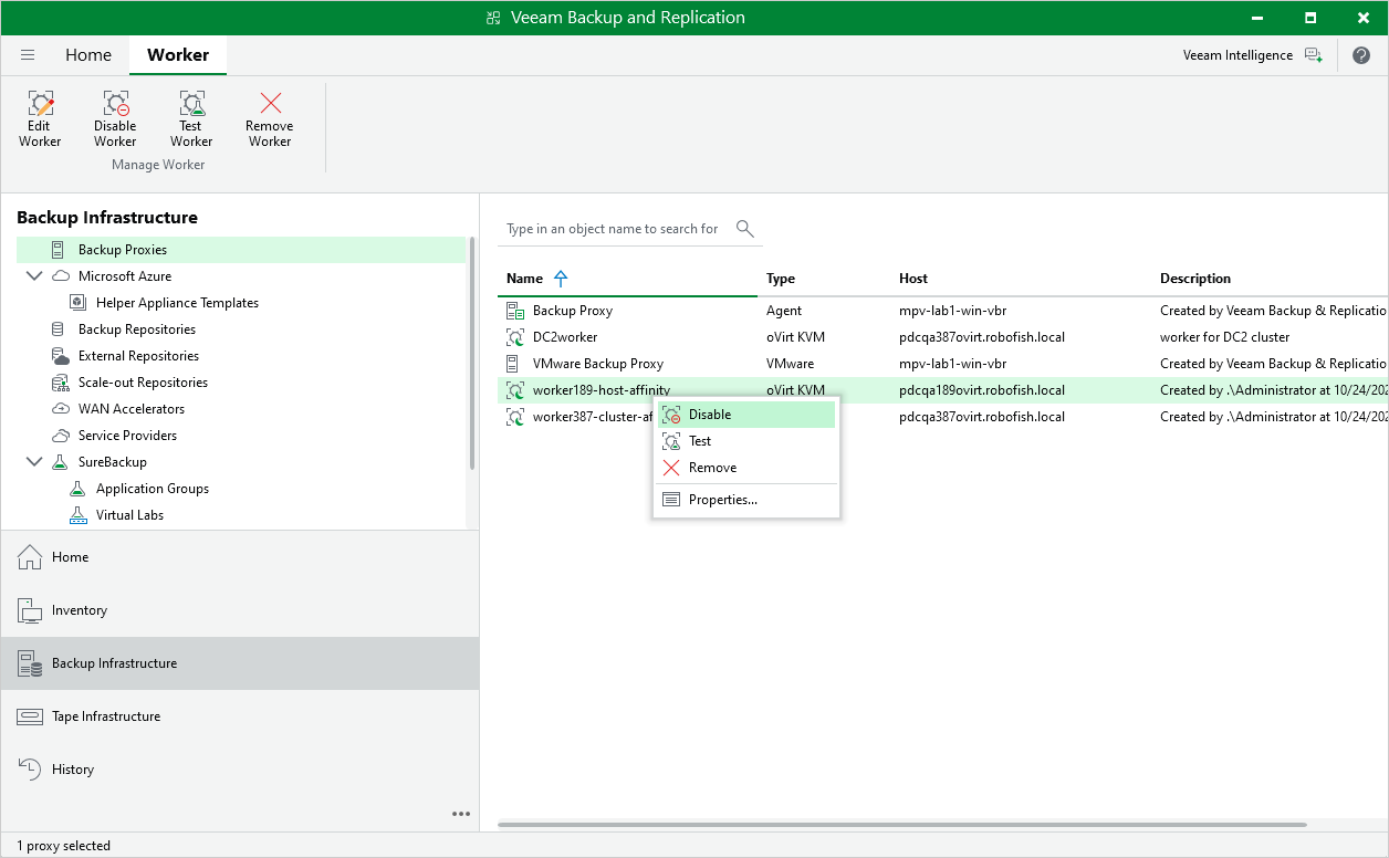 By default, workers are launched when jobs or restore sessions start. However, you can temporarily disable a worker — this may be helpful when you reconfigure a worker and you do not want it to be used for a backup or restore operation. You will still be able to enable the disabled worker at any time you need.