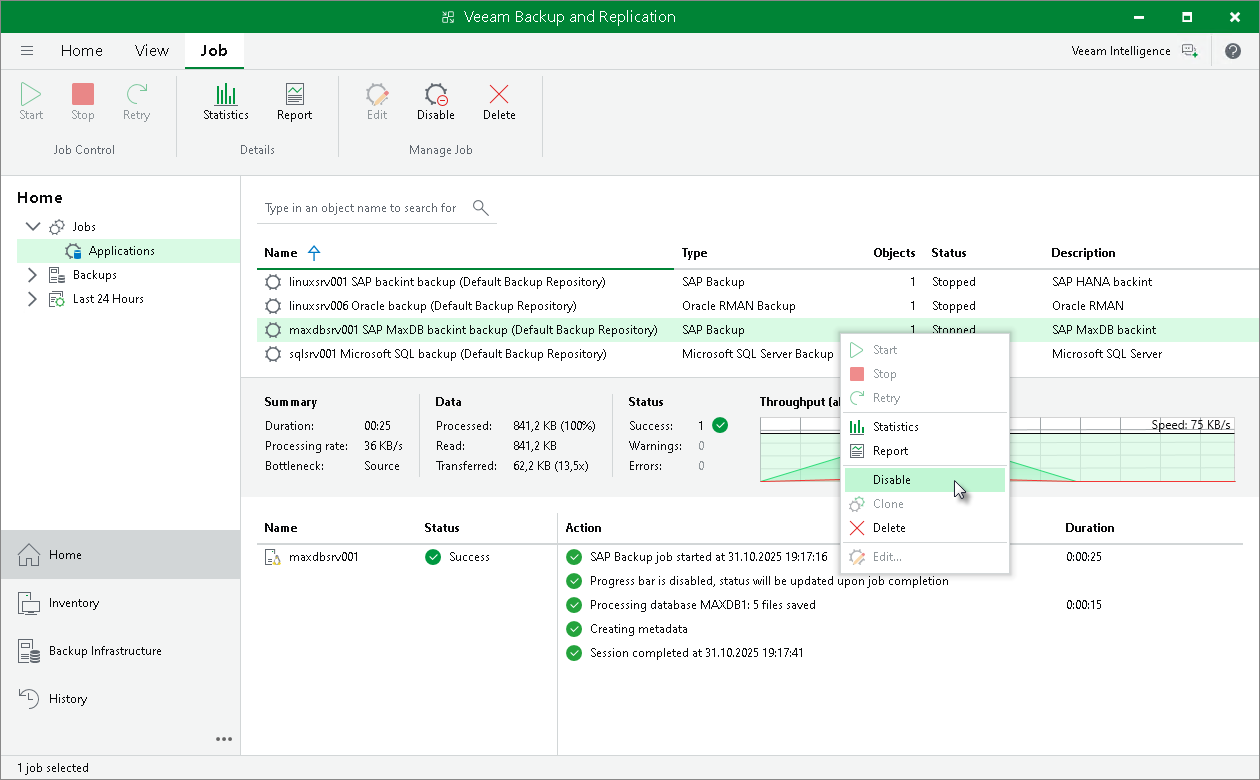 - In the working area, select the necessary job and click Disable on the ribbon. You can also right-click the job and select Disable.