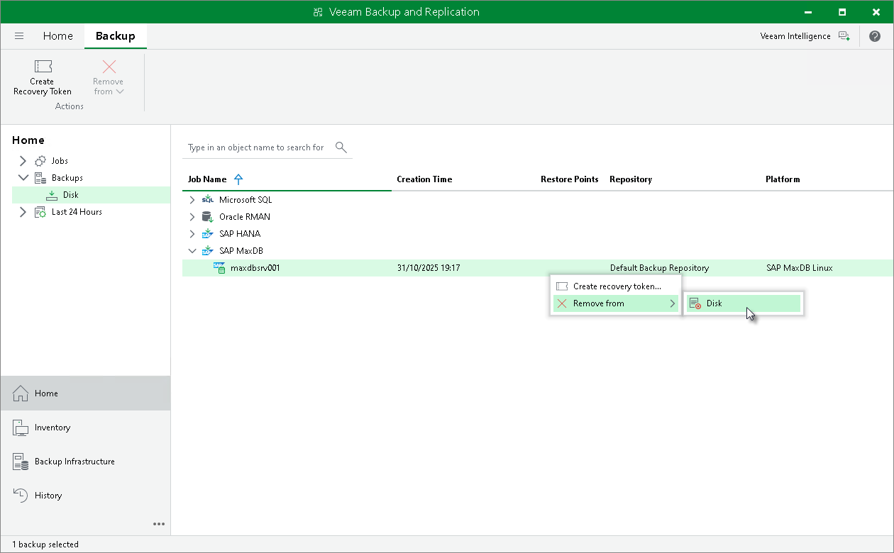 - In the working area, right-click the backup job object name and select Delete from disk.