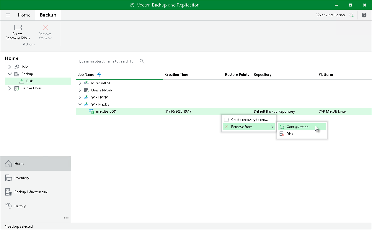 If you want to remove records about backups from the Veeam Backup & Replication console and configuration database, you can use the Remove from configuration operation.