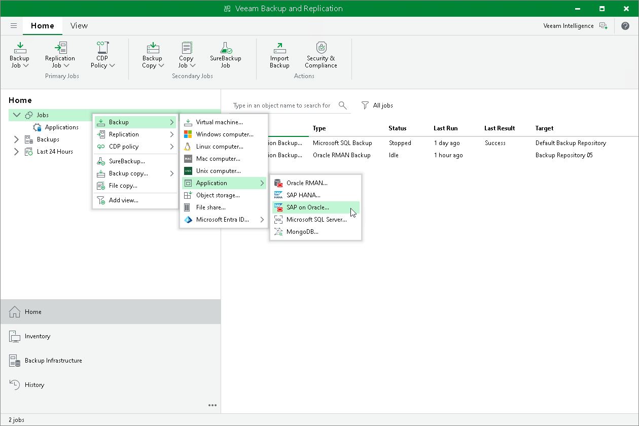 To create an application policy for Veeam Plug-In for SAP on Oracle, you must launch the New Application Backup Policy wizard. To do this, on the Home tab, click Backup Job > Application > SAP on Oracle.