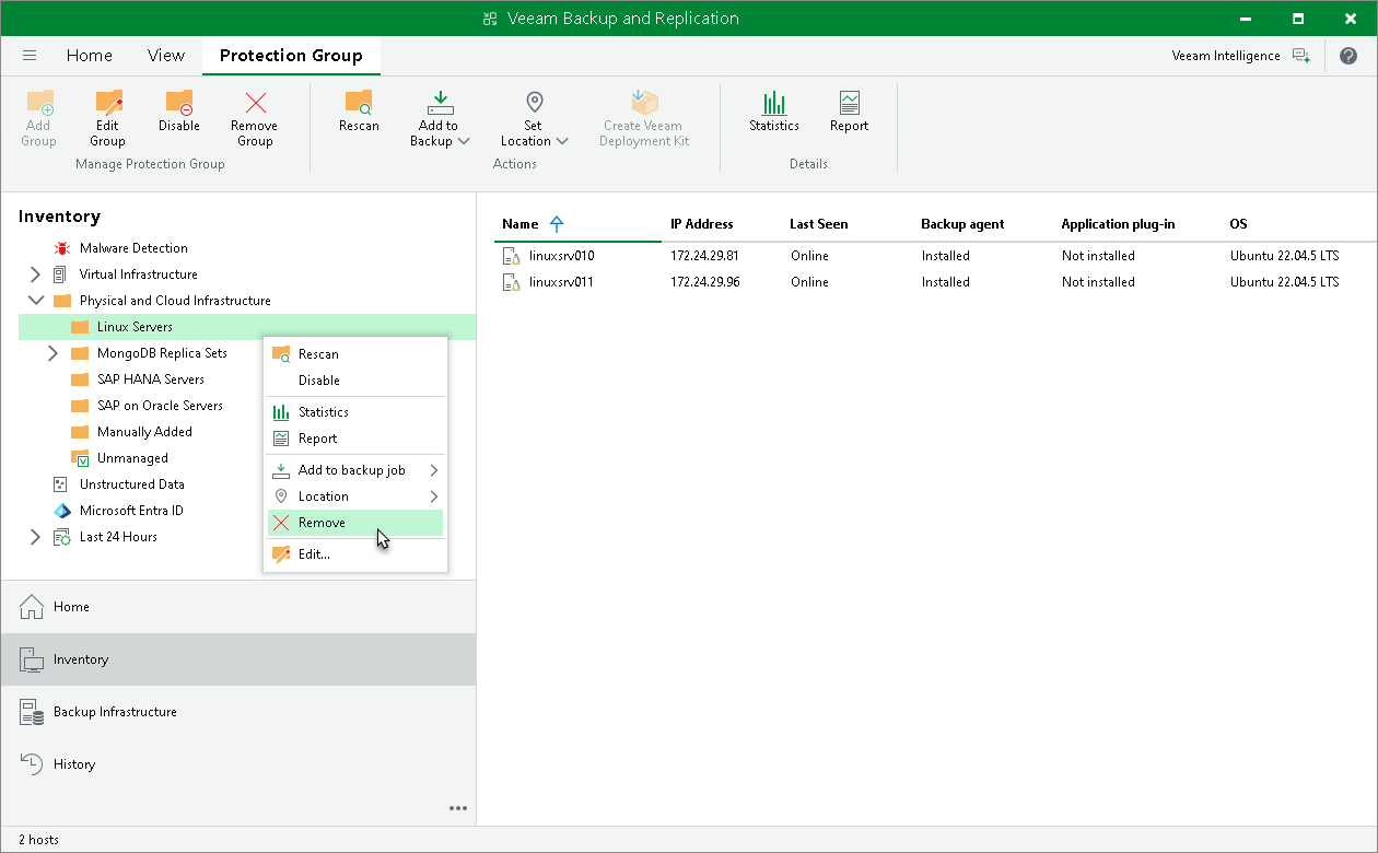 - In the inventory pane, select the protection group that you want to remove and click Remove Group on the ribbon or right-click the protection group and select Remove.