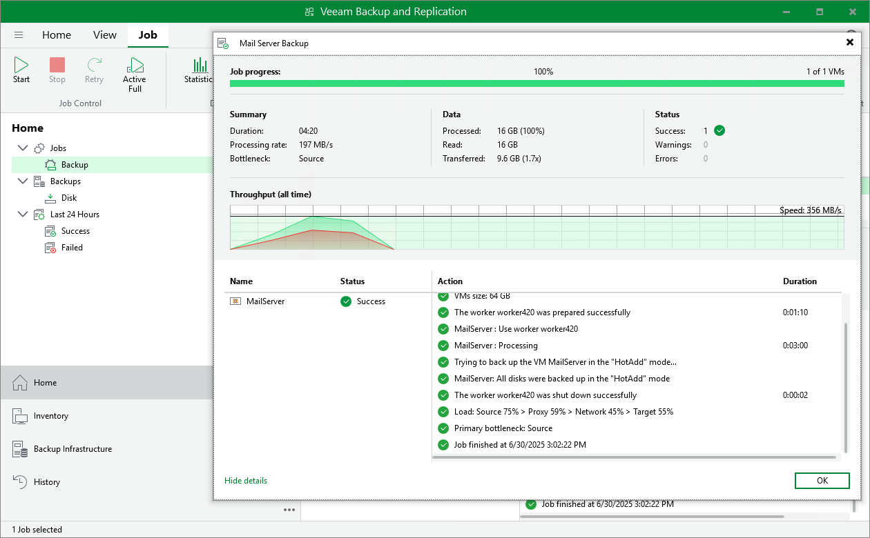 As any backup application handles a great amount of data, it is important to make sure the data flow is efficient and all resources engaged in the backup process are optimally used. For backup jobs, Veeam provides advanced statistics about the data flow efficiency and lets you identify bottlenecks at the following stages of the data transmission process: