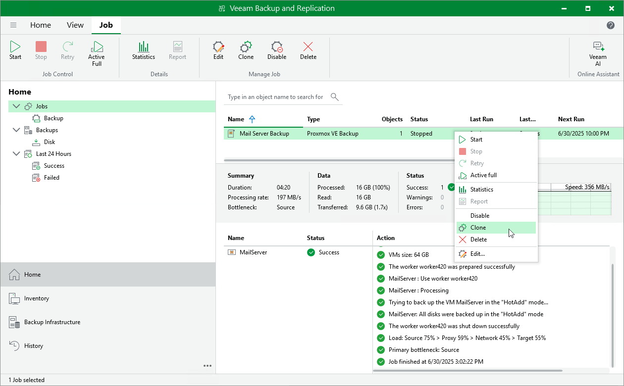 If the original job is scheduled to run automatically, Veeam Backup & Replication disables the cloned job. To enable the cloned job, select it in the job list and click Enable. |