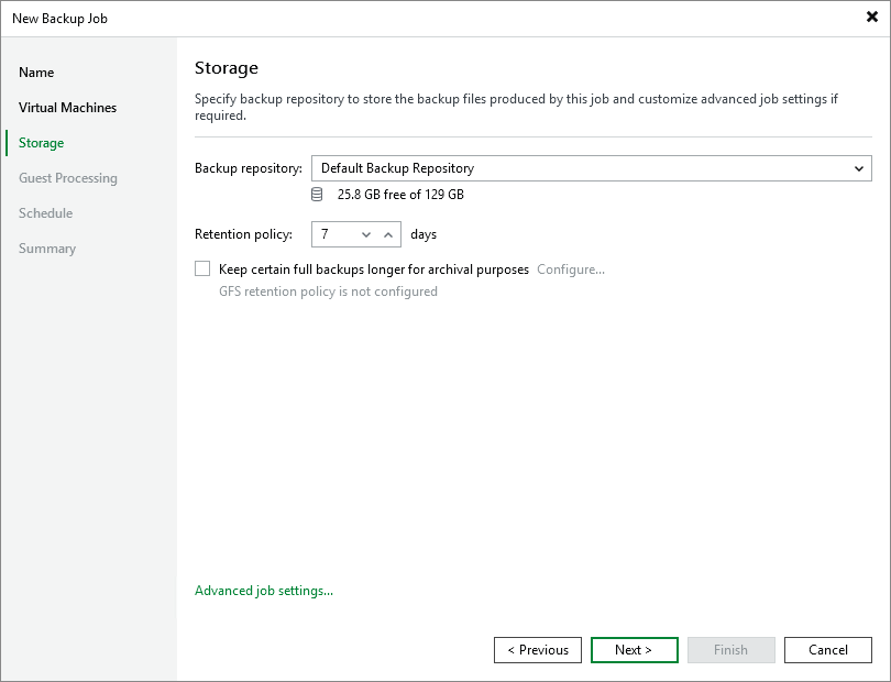 - In the Retention policy section, choose how long Veeam Backup & Replication will keep restore points in a backup chain. If a restore point is older than the specified limit, Veeam Backup & Replication will remove it from the chain. For more information on how Veeam Backup & Replication tracks and removes redundant restore points, see Retention Policies.