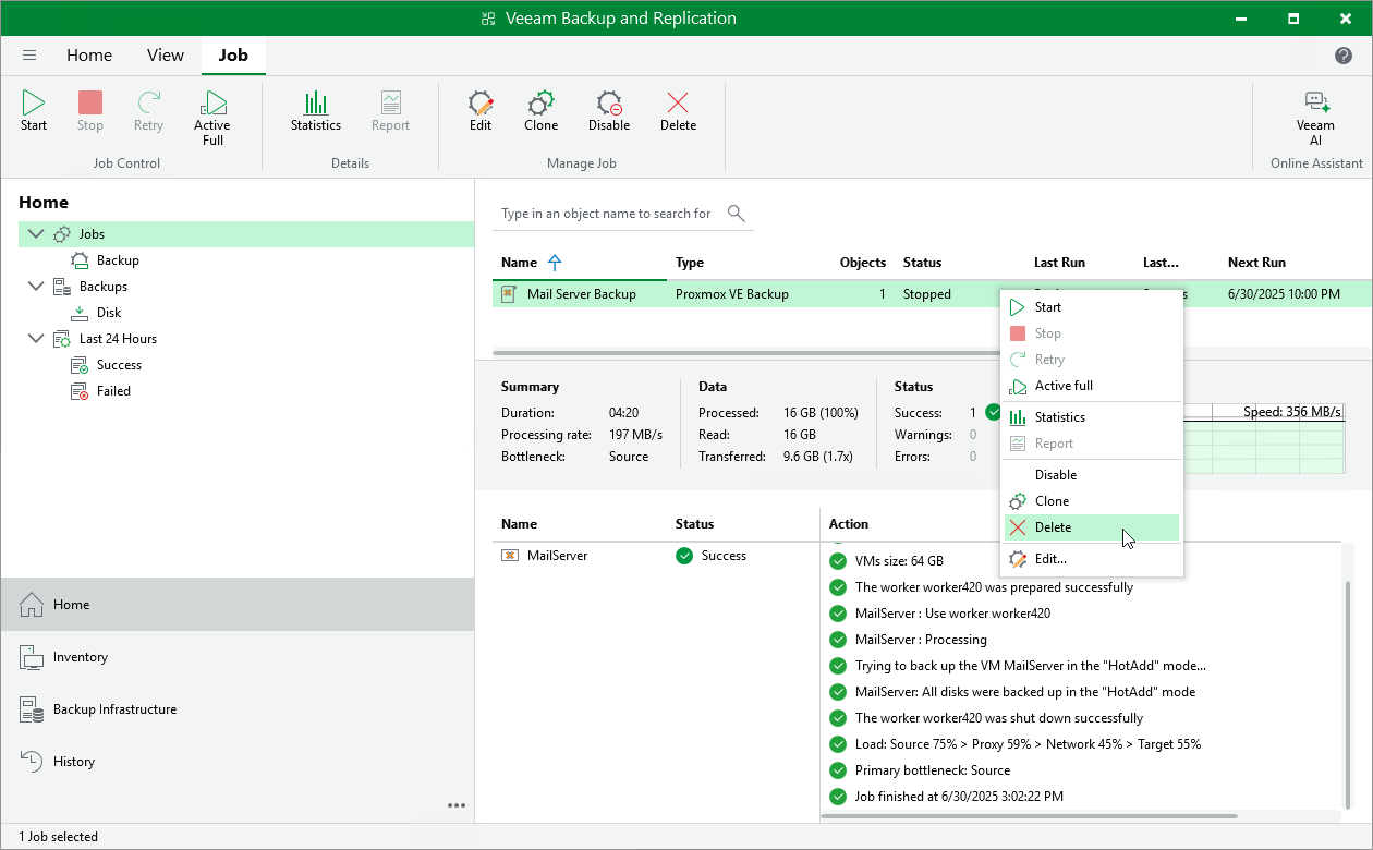 You can permanently delete a backup job from the Veeam Backup & Replication configuration database if you no longer need it. When you delete a job, backups created by this job are displayed under the Backups > Disk (Orphaned) node in the Home view of the Veeam Backup & Replication console.