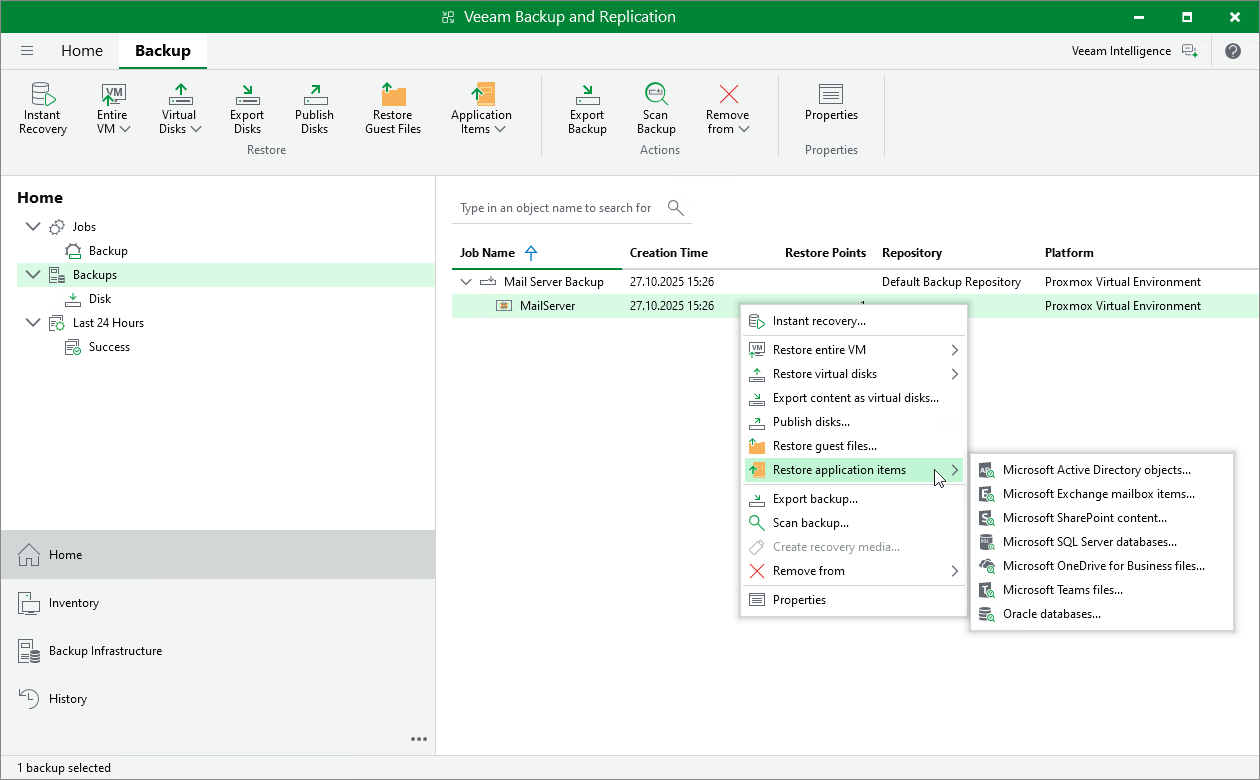 - In the working area, expand the necessary backup job, right-click the VM that contains an application you want to restore, select Restore application items and select the application.