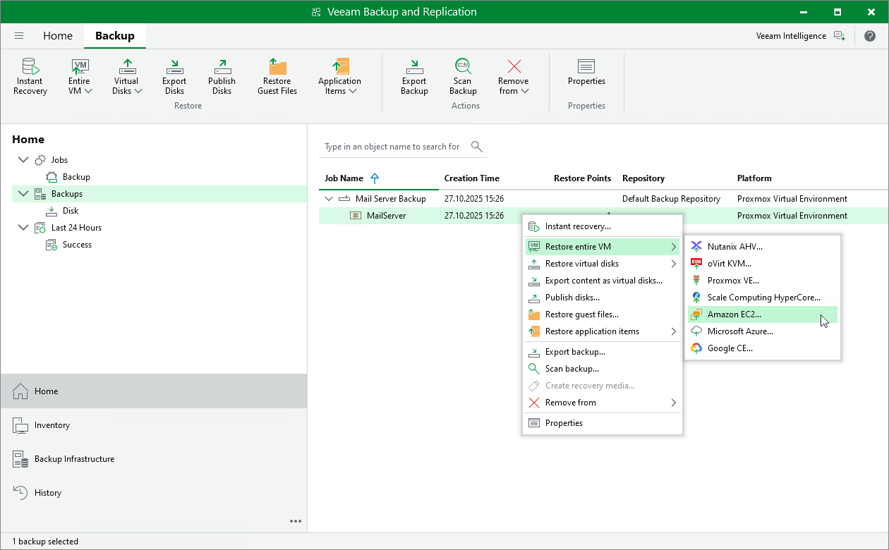 Alternatively, expand the necessary backup job, select the VM and click Entire VM > Amazon EC2 on the ribbon.