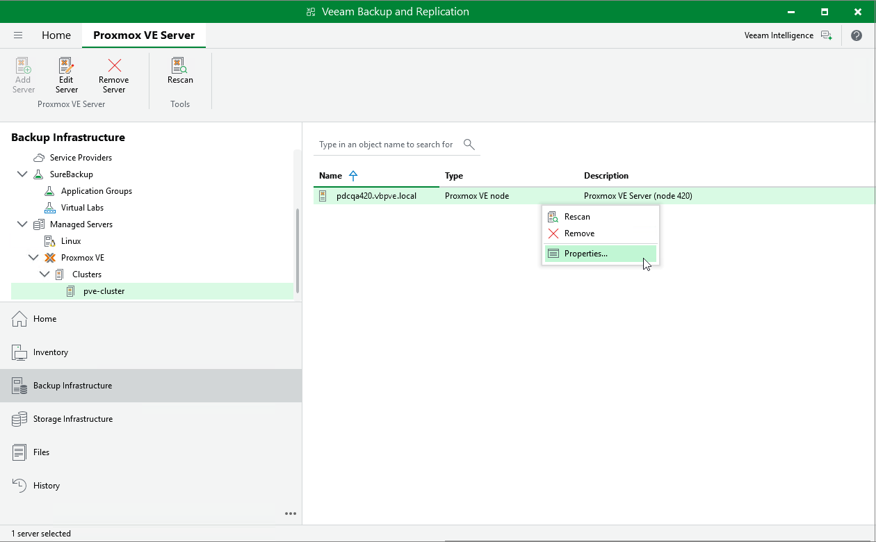 - In the working area, select the Proxmox VE server and click Edit Server on the ribbon, or right-click the Proxmox VE server and select Properties.
