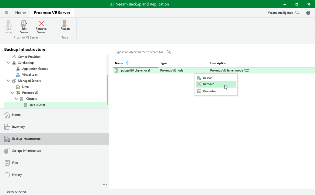 - In the working area, select the Proxmox VE server and click Remove Server on the ribbon, or right-click the Proxmox VE server and select Remove.