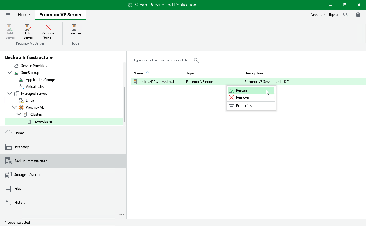- In the working area, select the Proxmox VE server and click Rescan on the ribbon, or right-click the Proxmox VE server and select Rescan.