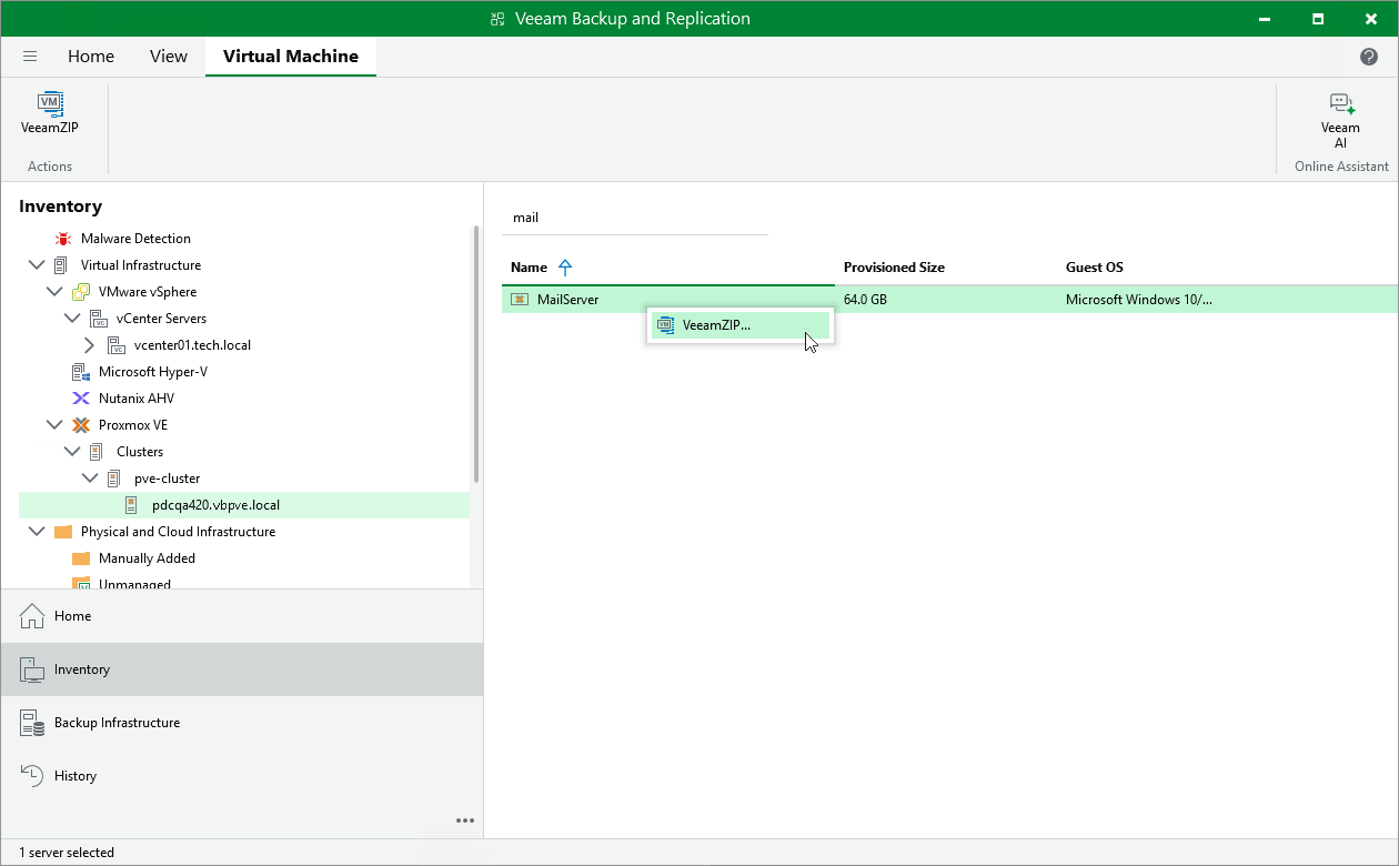 Alternatively, select the VM and click VeeamZIP on the ribbon.