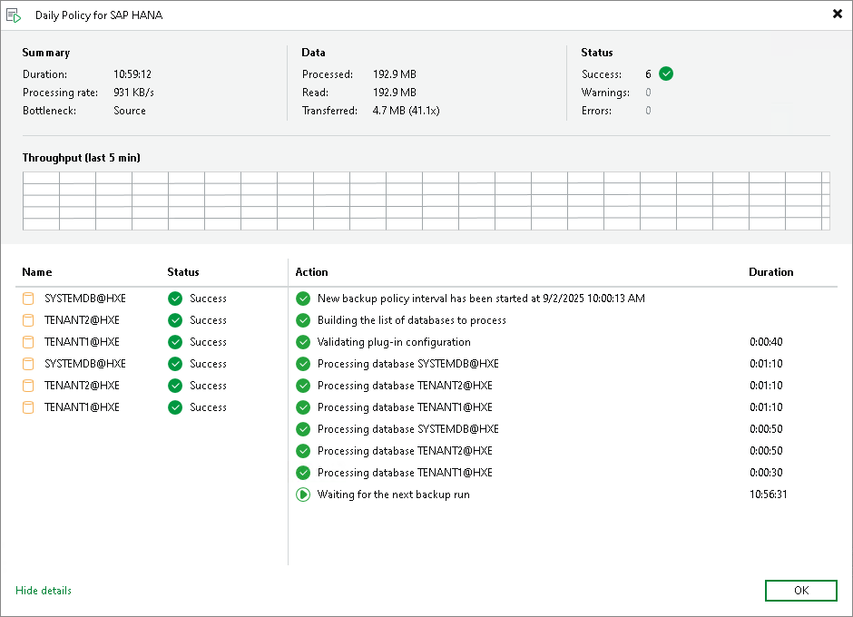 After the application backup policy session statistics becomes available in Veeam Backup & Replication, this statistics appears in the policy statistics window. The job session statistics becomes available in Veeam Backup & Replication on real-time basis.