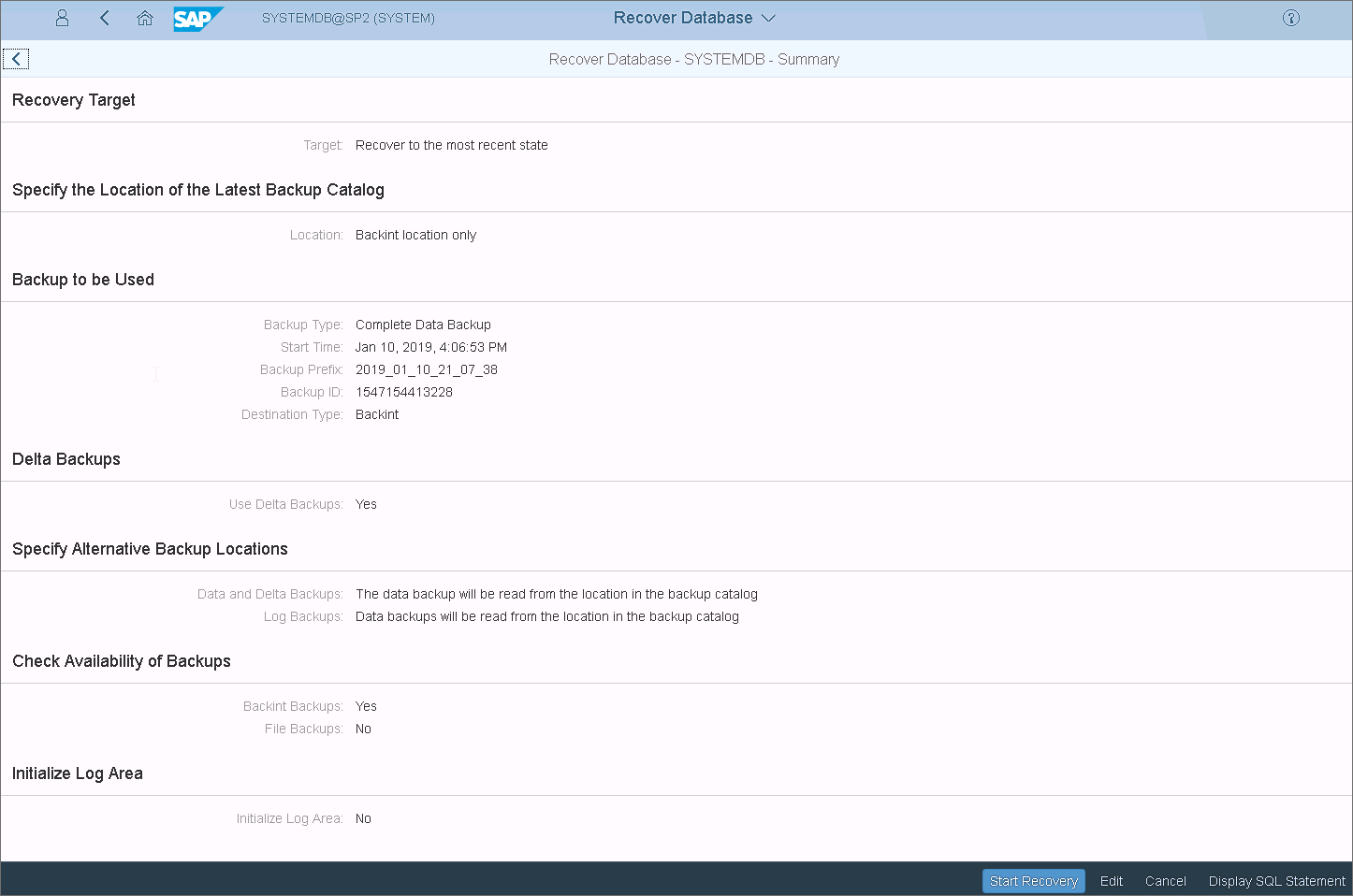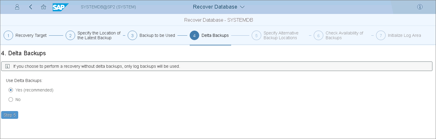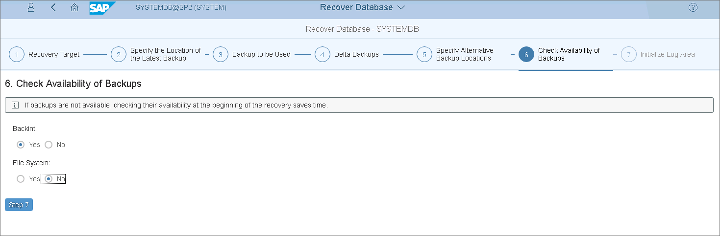 - At the Check Availability of Backups step, select Yes or No options, to check if the backups are available. Note that at this step SAP HANA does not check the integrity of the backup content on the block level.
