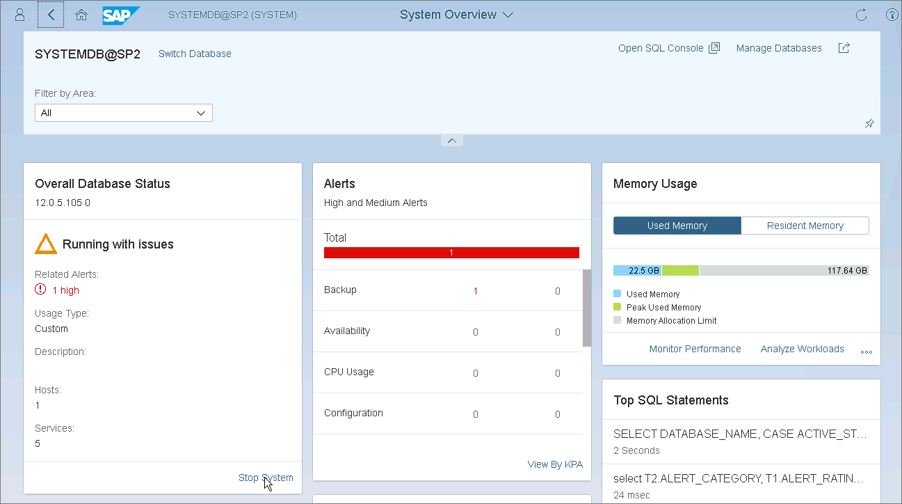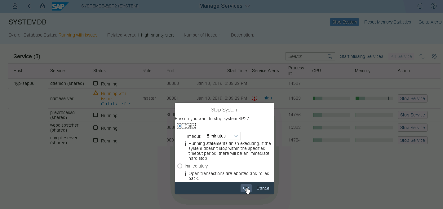 - At the Manage Services section, click Stop System and select the Softly option to shut down the database after SAP HANA finishes running statements.