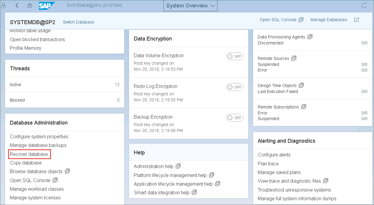 - In the SAP HANA Cockpit console, locate the database that you want to recover.