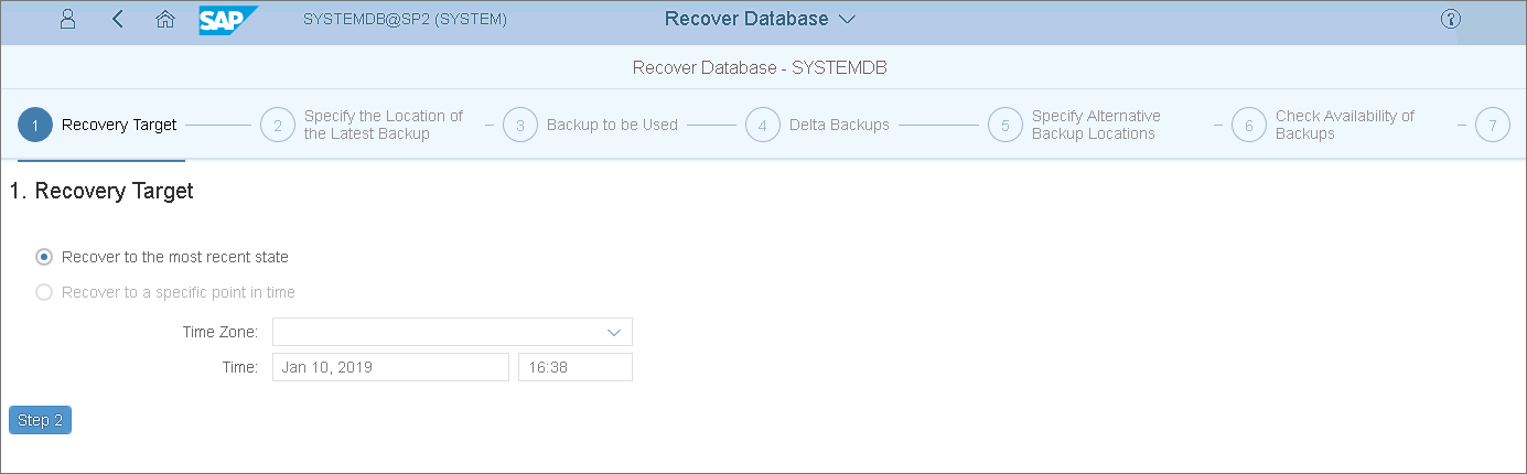 - At the Recovery Target step, select the required restore point or the option to restore the database to the most recent state. Then, click Step 2.