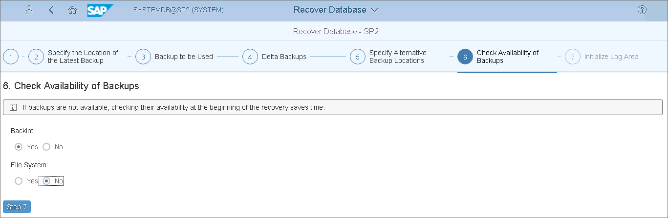 - Select Yes or No, to check if the backups are available. Note that at this stage SAP HANA does not check the integrity of the backup content on the block level.