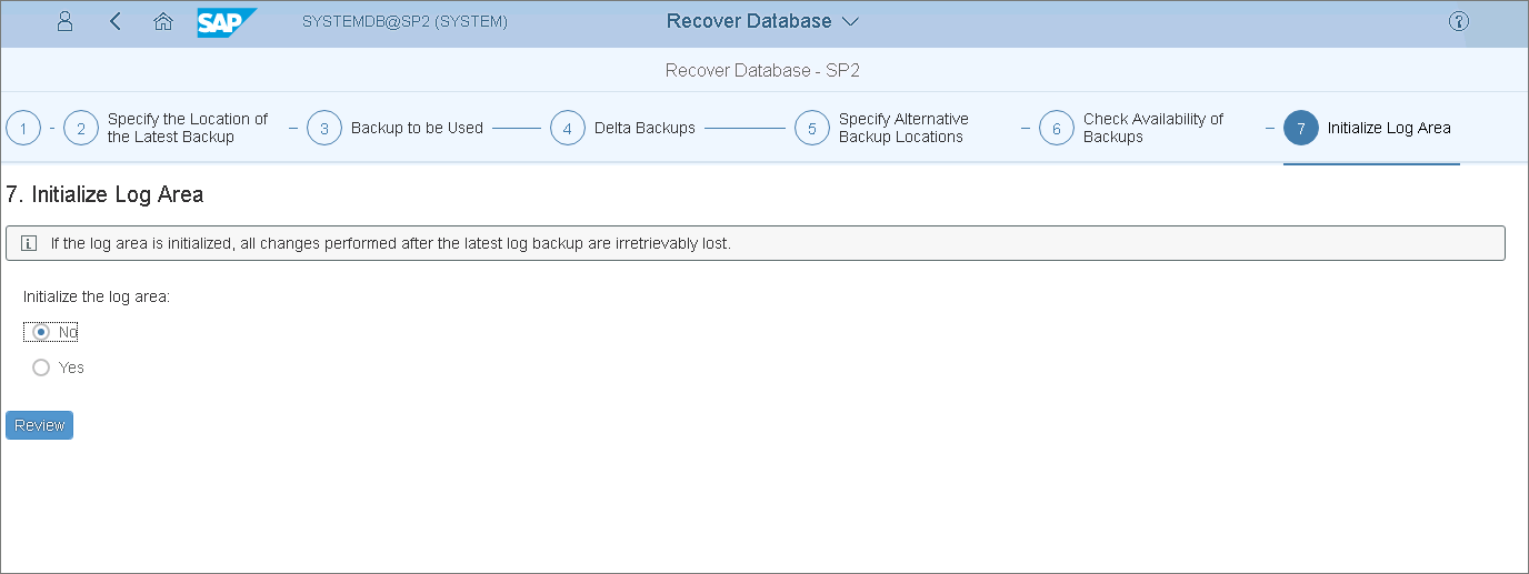 - Select No to initialize the log area and click Review. You must initialize the log area only if the log area is unavailable or if you are recovering the database to a different system.
