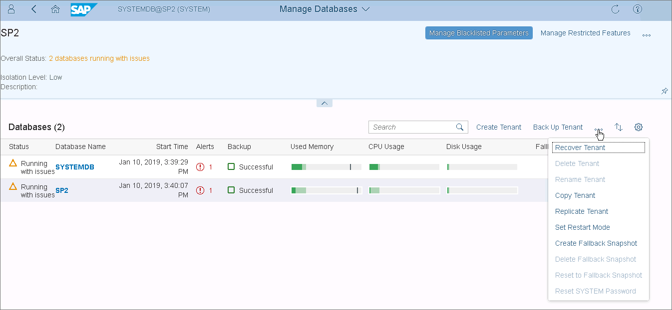 - In the Manage Databases page, expand the toolbar options and select Recover Tenant.