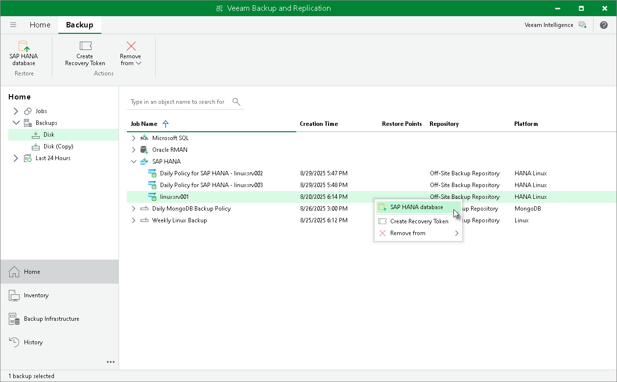 To perform restore from SAP HANA databases, you can also use Veeam Explorer cmdlets. For details, see the Veeam Explorer for SAP HANA section of the Veeam Explorers PowerShell Reference. |