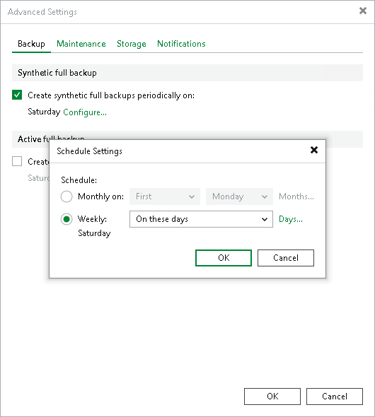 - To schedule active full backups, on the Backup tab, select the Create active full backups periodically check box, click Configure and choose whether you want to create active full backups on specific days every week or on specific days of specific months.