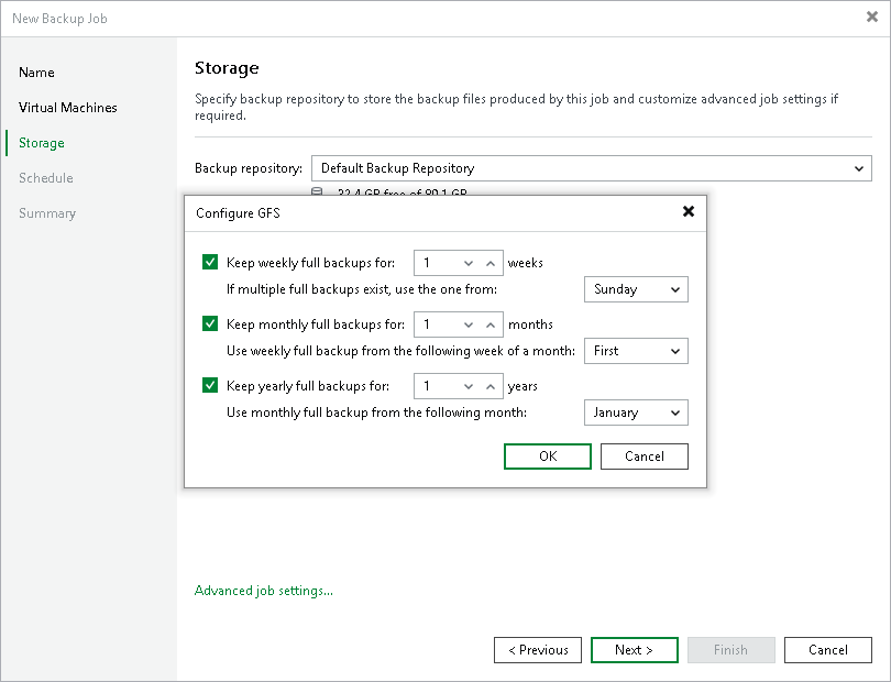 Grandfather-Father-Son (GFS) policy allows you to leverage full backups for long-term retentions instead of creating a new full backup every time. The mechanism simplifies the backup schedule and optimizes the backup performance.
