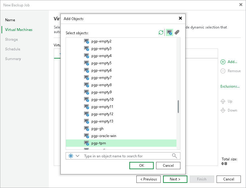 - In the Add Objects window, choose whether you want to back up all VMs in the cluster, only specific VMs or groups of VMs included into VM tags: