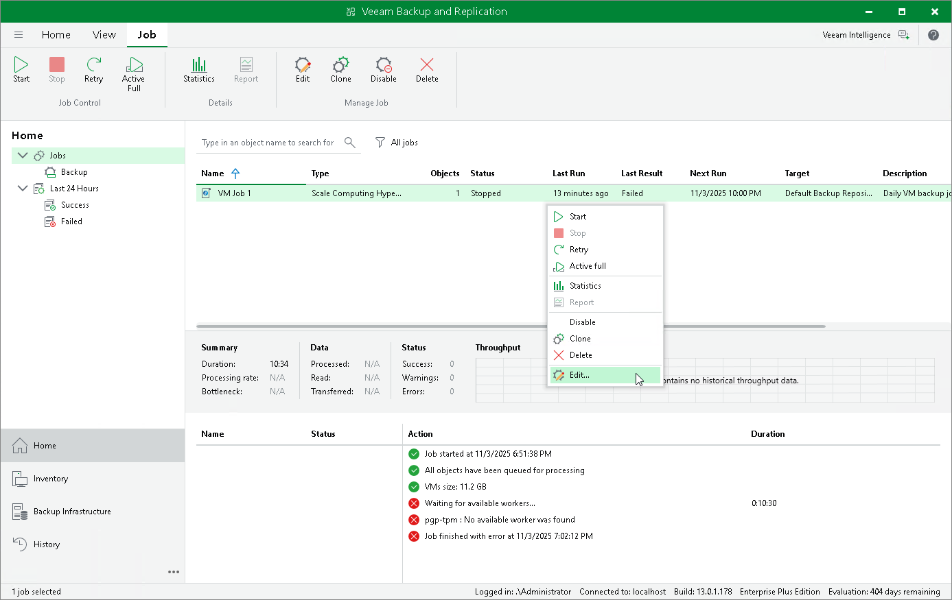 - In the working area, select the necessary job and click Edit on the ribbon.