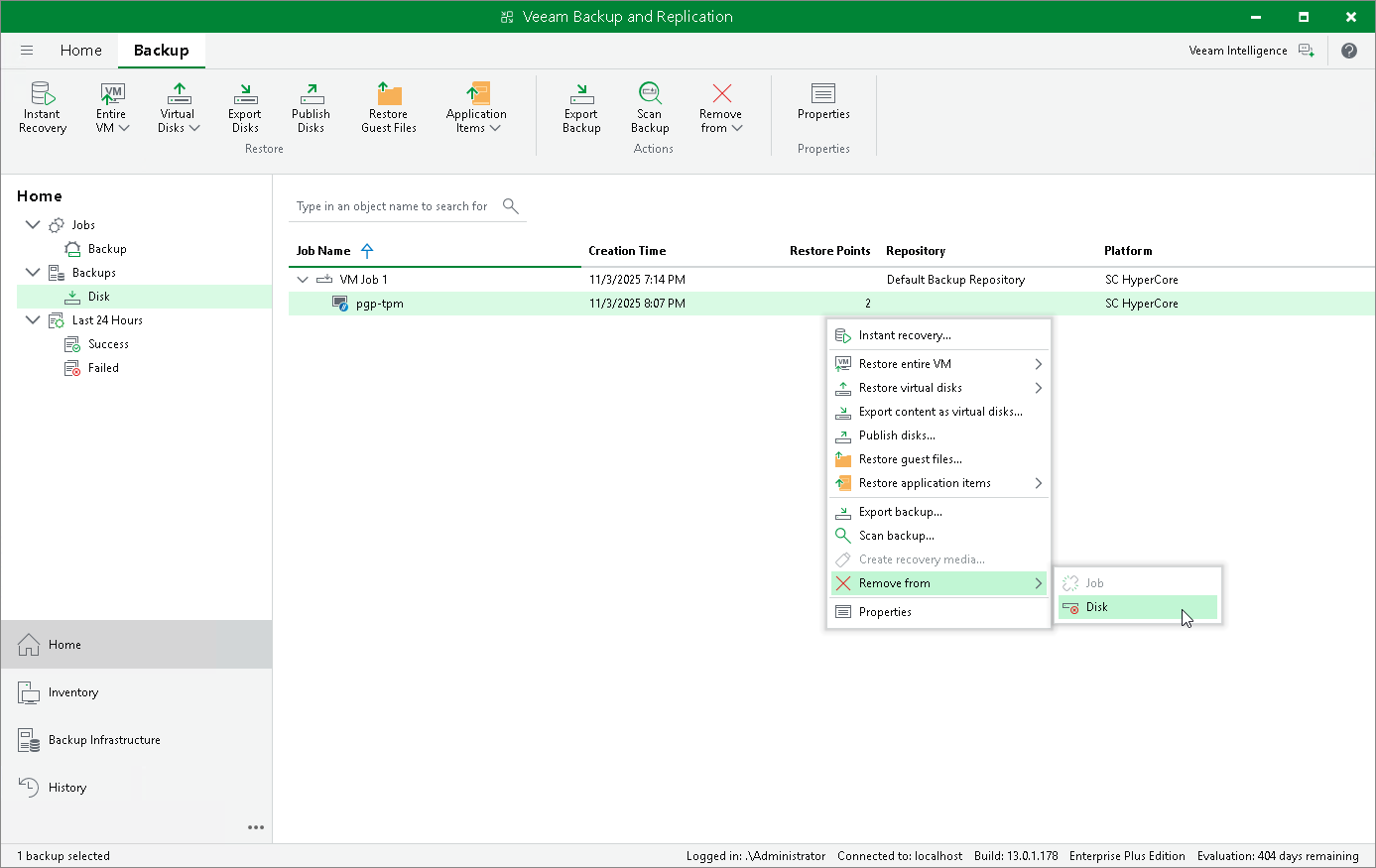- In the working area, expand the job that created the backup, right-click the VM name and select Remove from > Disk.