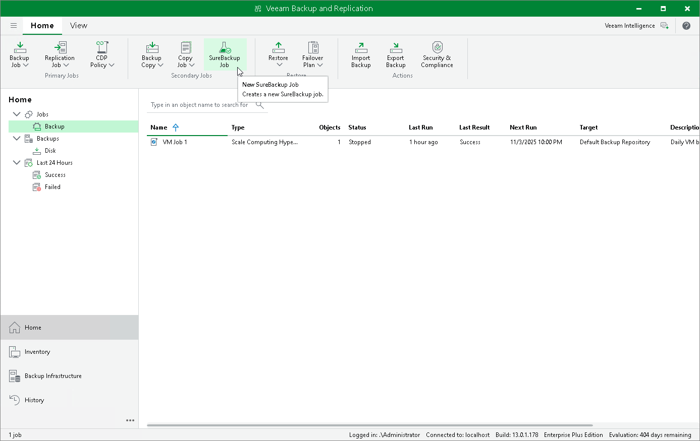 - In the inventory pane, select Jobs > Backup and click SureBackup Job on the ribbon.
