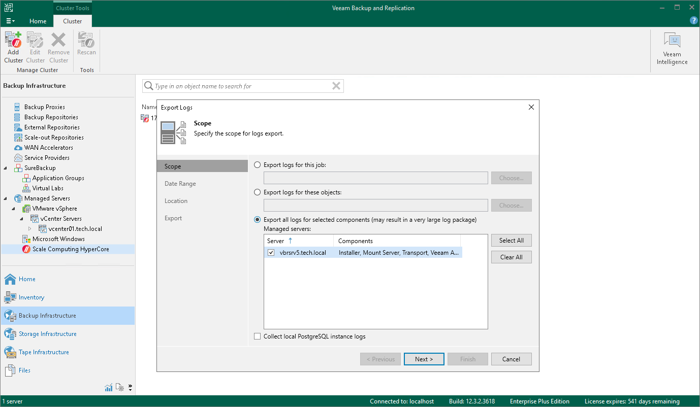 - At the Scope step of the Export Logs wizard, select the Export all logs for selected components option. Then, in the Managed servers list, select the backup server.