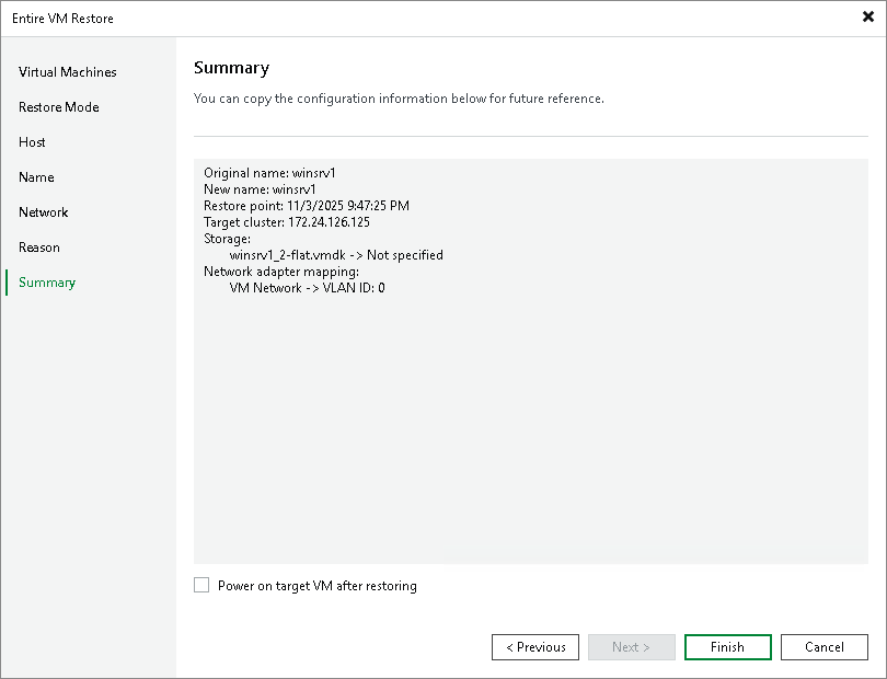 Step 8. Finish Working with Wizard At the Summary step of the wizard, review summary information and click Finish.TipIf you want to start the recovered VM as soon as the restore process completes, select the Power on target VM after restoring check box.