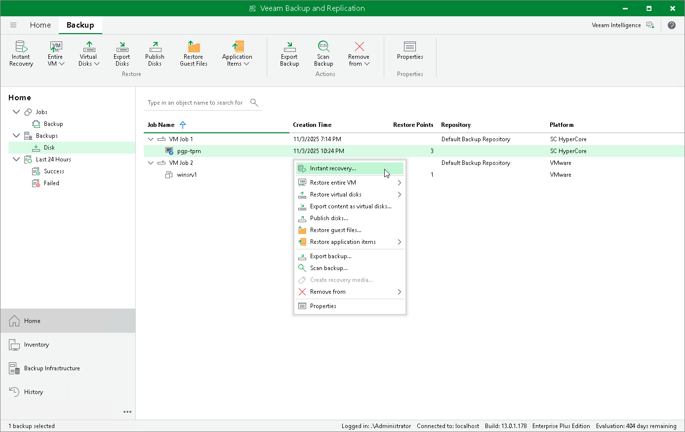 - In the working area, expand the necessary backup job, right-click the VM you want to restore and select Instant recovery.