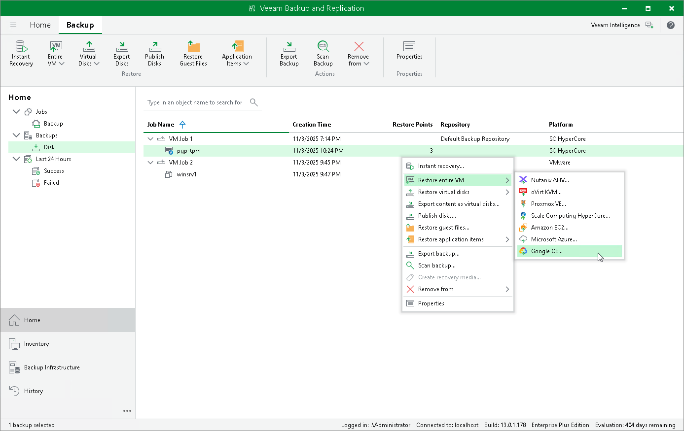 - In the working area, expand the necessary backup job, right-click the VM that you want to restore and select Restore to Google CE.