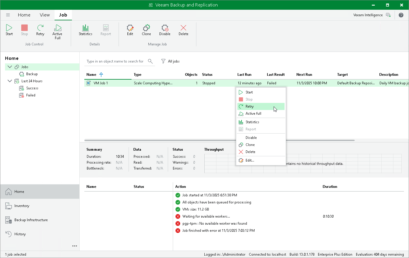 If a job fails, you can retry the backup operation. When you perform a retry, Veeam Plug-in for Scale Computing HyperCore restarts the operation only for the failed resources added to the job and does not process VMs that have been processed successfully. As a result, in cases when only a part of source objects remain unprotected, retrying a job takes less time compared to restarting the job for all resources.