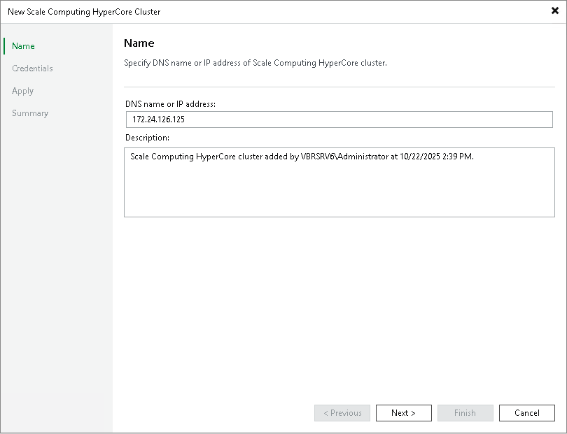 - In the DNS name or IP address field, enter the FQDN or IP address of the Scale Computing HyperCore standalone host or cluster node.