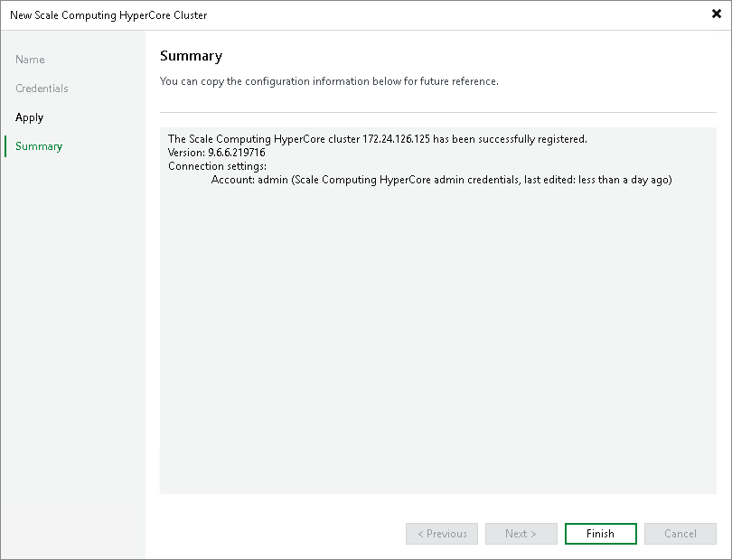 Step 5. Finish Working with Wizard At the Summary step of the wizard, check that the Scale Computing HyperCore cluster has been successfully added and click Finish.