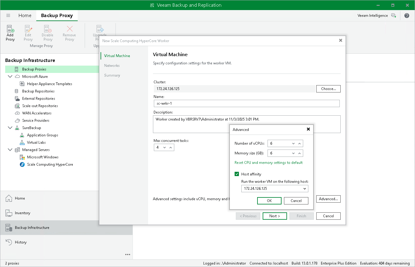 The default number of concurrent tasks is set to 4. When you change this value, the wizard automatically adjusts the amount of resources that will be allocated to the worker. If you want to specify the amount of resources manually as well as configure host affinity, click Advanced.