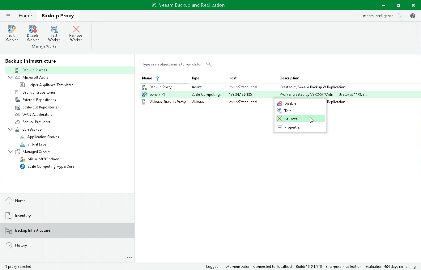 Veeam Plug-in for Scale Computing HyperCore allows you to permanently remove workers if you no longer need them. Note that you can remove a worker only when it is not processing a backup or restore operation.