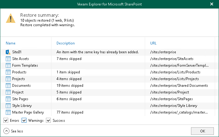 Step 4. Review Summary At the Restore summary step, click See more to expand the window and review details of the restore operation and click OK.You can filter notifications by their status: Error, Warning or Success.