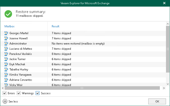 Step 6. Review Summary At the Restore summary step, click See more to expand the window and review details of the restore operation and click OK.You can filter notifications by their status: Error, Warning or Success.